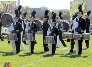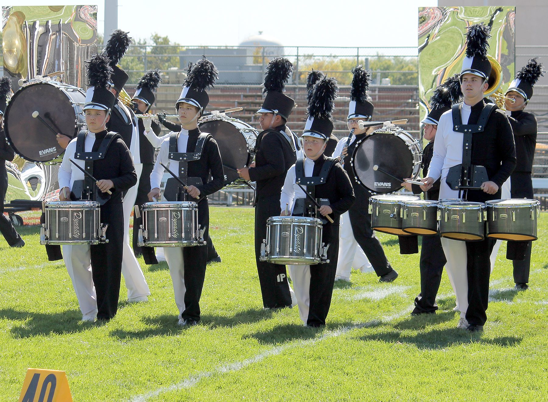 Members of the Marching Arrows drumline perform during the field competition at the Tri-State Band Festival in Luverne on Saturday, Sept. 27. The Arrows will perform next at the Festival of Bands in Sioux Falls on Saturday, Oct. 4. Photo by Kyle Kuphal