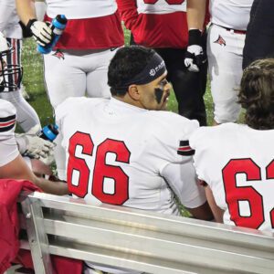 University of Wisconsin-River Falls offensive lineman Hunter McKinney talks with teammates on the sidelines during the NCAA Division III national championship football game on Sunday, Jan. 4, in Canton, Ohio. (Contributed photo)