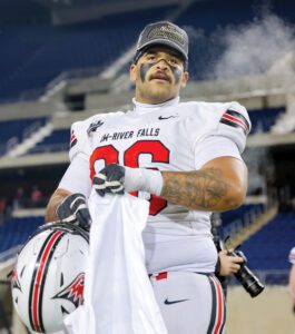 University of Wisconsin-River Falls football player Hunter McKinney (66) models a “National Champions” hat after the Falcons defeated North Central (Ill.) for the NCAA Division III title on Sunday, Jan. 4, at Tom Benson Hall of Fame Stadium in Canton, Ohio. McKinney, a former Pipestone Area Schools player, is an offensive tackle for UWRF. (Contributed photo)