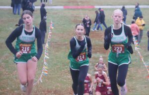 Pipestone Area Schools’ runners Hadley Fruechte, Makenley DeWilde and Isabella Russell compete during the Big South Conference championships on Tuesday, Oct. 14 in Luverne. (Star photo by Eric Viccaro)