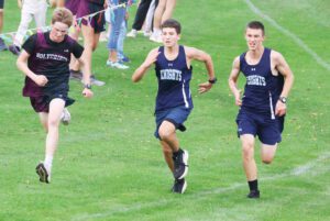 Mountain Lake Area-Comfrey’s Jonathan Harder Schrock and Russell-Tyler-Ruthton’s Jacob Nilles and Collin Schulze jockey for position during the homestretch. (Star photo by Eric Viccaro)