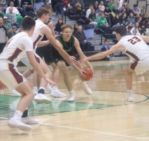Pipestone Area Schools’ Blake Bosma attempts to play keep away from Blue Earth Area defenders during a Big South Conference game on Friday, Dec. 5. (Star photo by Eric Viccaro)