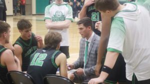 Pipestone Area Schools’ head coach Michael Slaba talks to the team during a timeout. (Star photo by Eric Viccaro)