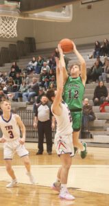 Pipestone Area’s Matthew DeBates (12) attempts a shot while defended by Tracy-Milroy-Balaton’s Taylor Swenhaugen during a 2024-25 festival game. (Photo by Eric Viccaro)