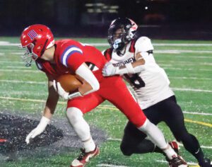 After that fateful measurement, HBC eventually scored its second TD on a Jamin Metzger 8-yard rush. Riggins Rheault powered through for the two-point conversion at the 2:36 mark of the first quarter, and the Patriots were up 14-0.