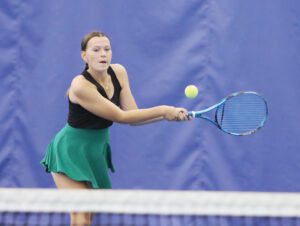 Pipestone Area Schools’ Vivian Brockberg hits a forehand during a doubles match on Monday, Oct. 13, at Huether Family Match Pointe in Sioux Falls, S.D. (Star photo by John Draper)