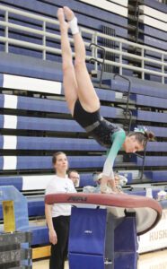 Pipestone Area Schools’ Brooke Einck prepares to dismount on the vault in a Big South Conference meet at Jackson Thursday, Dec. 4. (Star photo by John Draper)