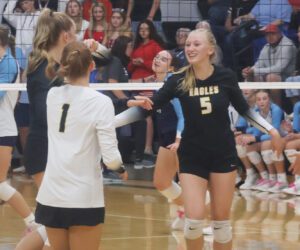 Southwest Minnesota Christian’s Gracelyn Fick (5) reacts with Eagle teammates after winning a point during this Red Rock Conference match on Sept. 25. (Star photo by Eric Viccaro)