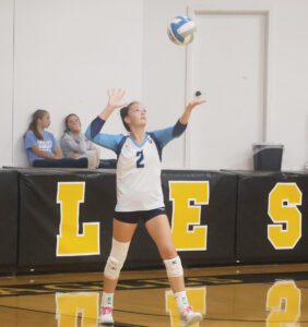 Russell-Tyler Ruthton’s Dru Ellefson (2) was one of several strong servers for the Knights in a Red Rock Conference sweep over Southwest Minnesota Christian on Sept. 25. (Star photo by Eric Viccaro)