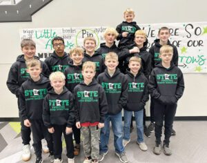 Pipestone Little Arrows wrestlers gathered for this photo during their send-off to the Northland Youth Wrestling Association state tournament in Rochester in spring 2025 (Contributed photo)