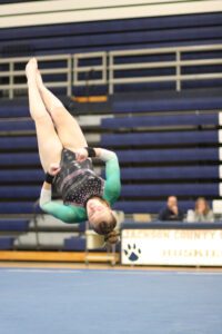Pipestone Area Schools’ Kaysa Douty performs in the floor exercise during a Big South Conference meet at Jackson Thursday, Dec. 4. (Star photo by John Draper)