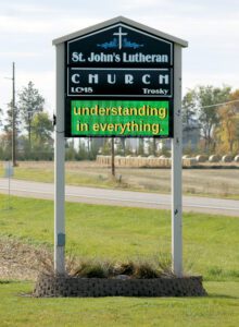 This sign along U.S. Highway 75 is owned by St. John’s Lutheran Church in Trosky. It’s not clear what will happen to the sign after the church closes. Photo by Kyle Kuphal